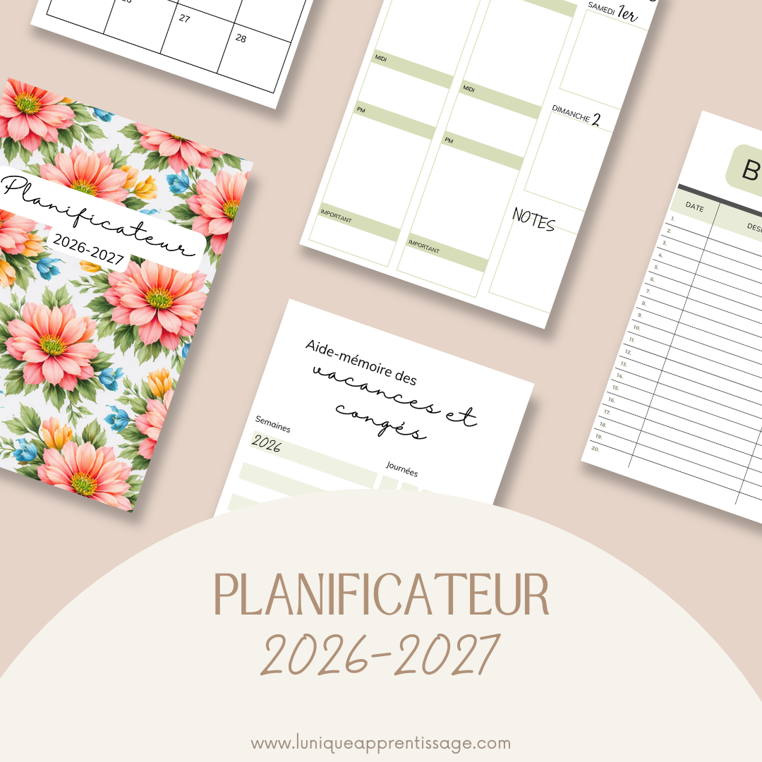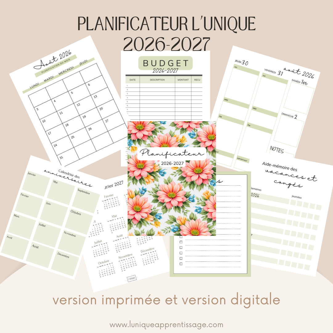 Découvrez le planificateur de L’UNIQUE 2026-2027. Un agenda qui pourra vous accompagner tout au long de l’année. À partir d’août 2026 jusqu’à août 2027, vous retrouverez :